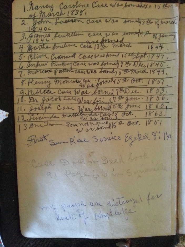 A page from a family bible showing the children of Jacob Case and Lucinda Laughter. "This bible belongs to James Howard Case, Sr, grandson of Jacob Case. This page lists the 13 ch of Jacob & Lucinda Case. Posted by Maria Clark in 2013." Reposted by Ancestry.com user norannl, Euless, Texas, on January 25, 2018.